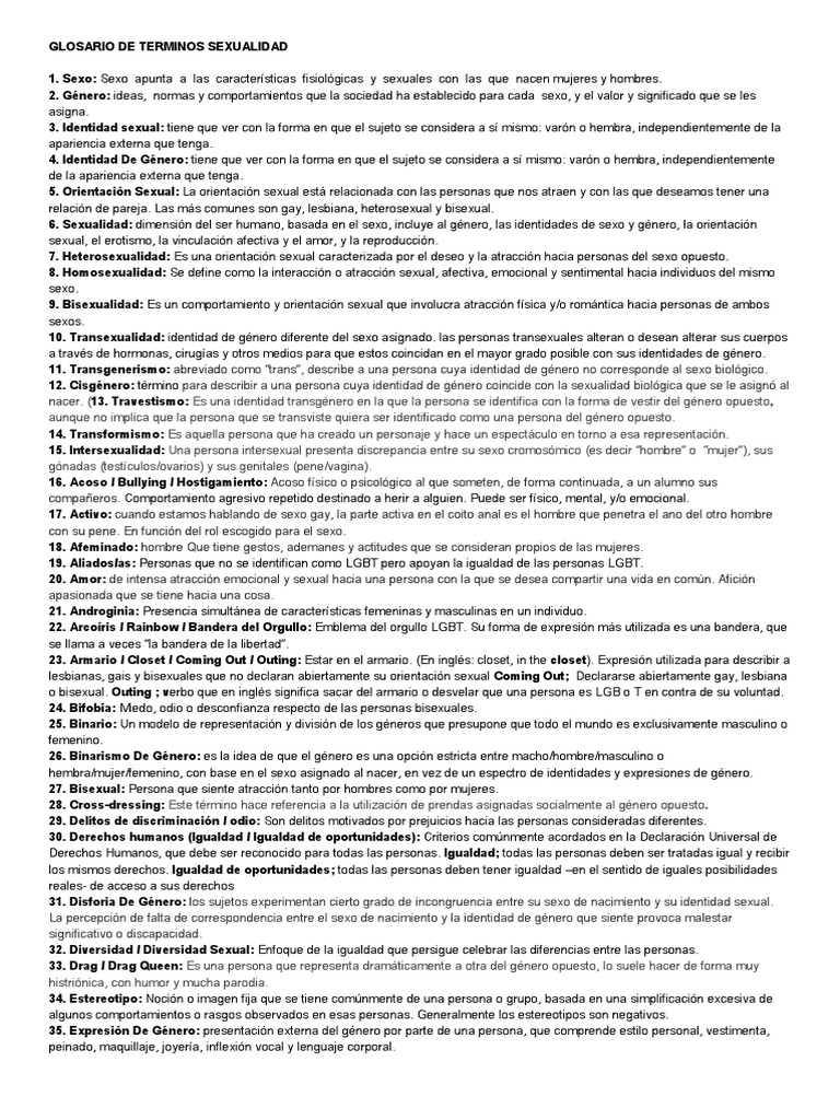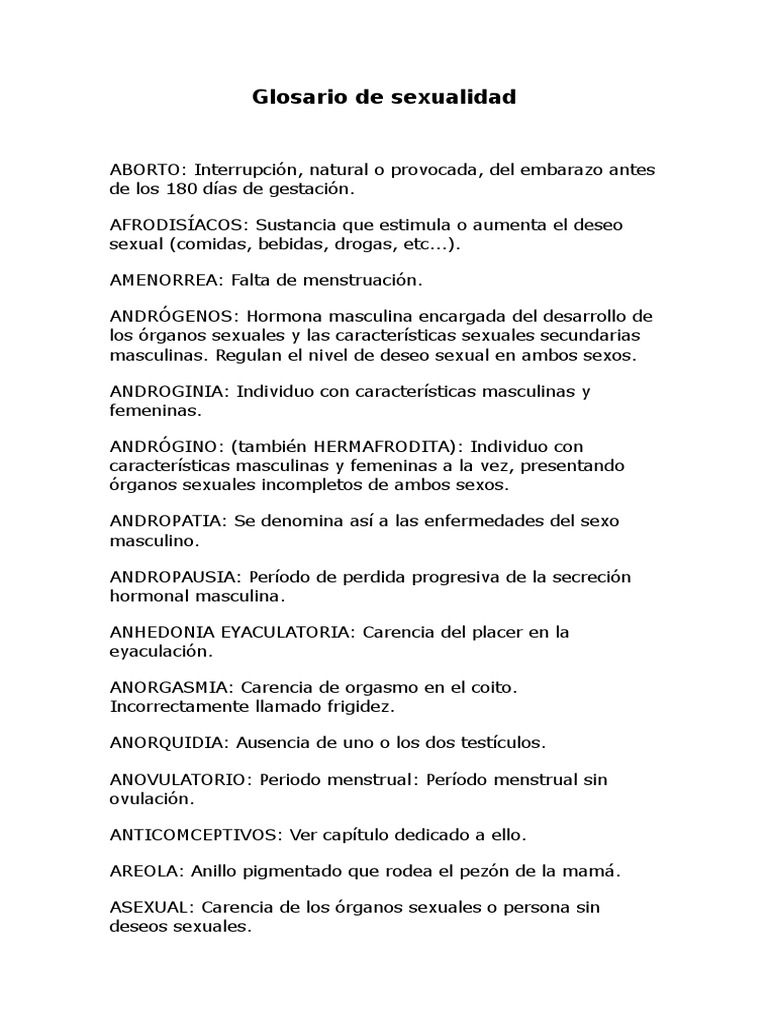 Conocimiento de su cuerpo. I Este glosario ha sido publicado en formato de políptico por parte de CENSIDA y fue difundido por esta institución en el marco de la Jornada Nacional contra la Fobia hacia la Diversidad Sexual el pasado. Además de conseguir derechos y libertades durante los últimos 100 años se han ido descubriendo los entresijos de la sexualidad humana. EDUCACIÓN DE LA SEXUALIDAD Y AFECTIVIDAD GUÍA PARA DOCENTES UTOREST GLOSARIO DE TÉRMINOS1 Género y sexo. Los trucos para volver a encontrar el deseo en la pareja. Glosario de términos de sexualidad. Tales definiciones y comprensiones están influenciadas por fuerzas individuales relacionales comunitarias y sociales.