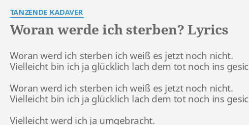 Watch the video for woran werd ich sterben from Tanzende Kadavers DellaMorte DellAmore for free and see the artwork lyrics and similar artists.